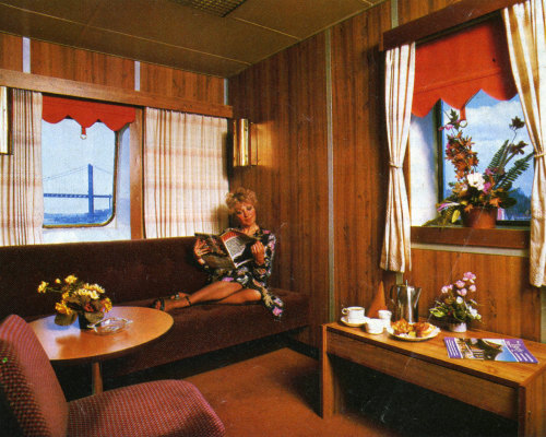 | Above and below: The cabins themselves were comfortable by the standards of their day and these pictures on the Kronprinsessan Victoria show (above) one of the four corner deluxe cabins and (below) a standard two berth inside room, complete with Sessan Linjen mermaid logo blanket. |