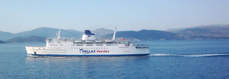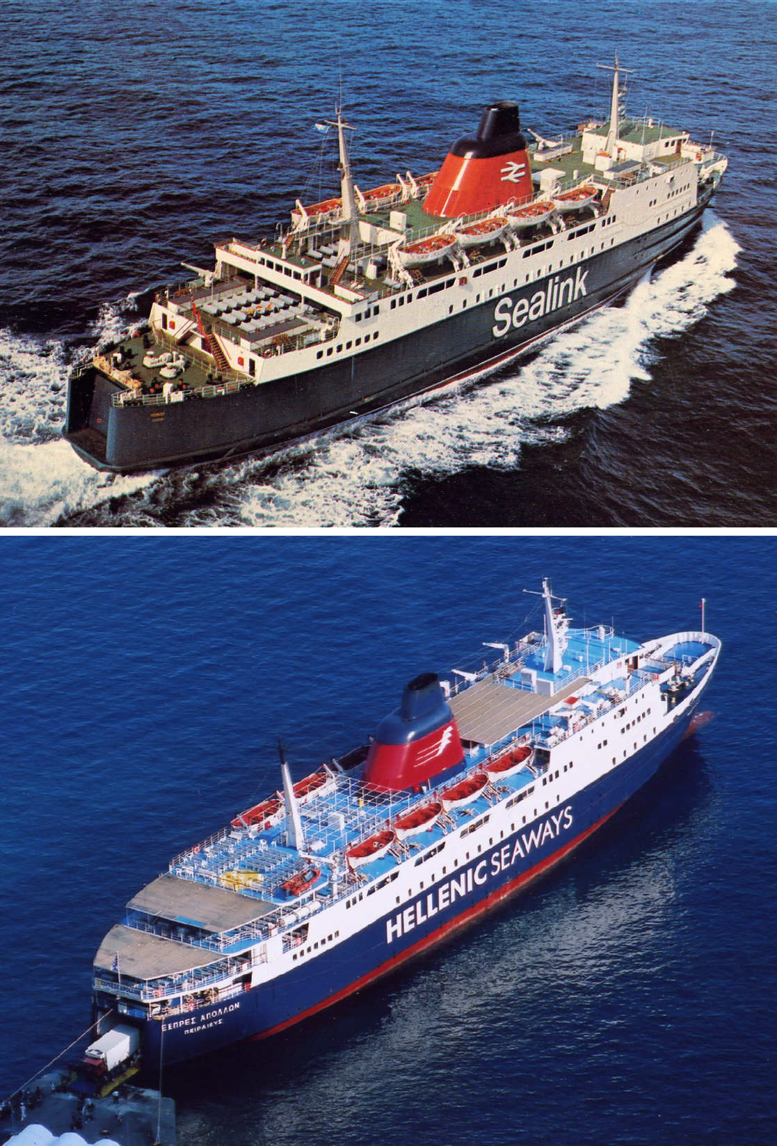 | Below: Comparison of the Express Apollon (ex-Senlac) (bottom) seen from the cliffs at Santorini with a similar angle of sister Hengist in her original state in the mid-1970s.