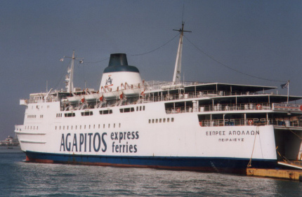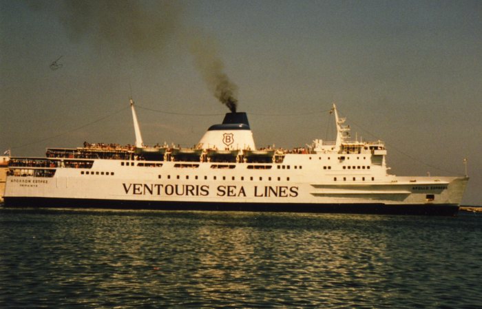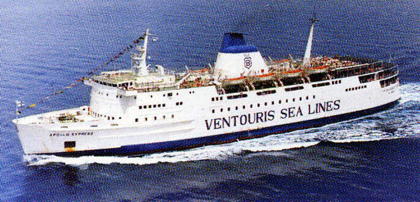 Senlac's sale was finalised in November 1987 and the ship sailed for Greece in December. Her new owners were one of the various companies controlled by the fiercely competetive Ventouris brothers, in this case Vangelis Ventouris whose company Ventouris Sea Lines also operated, amongst others, the Georgios Express (ex-Roi Baudouin of RMT), Panagia Tinou (ex-Koningin Wilhelmina of SMZ) and Kimolos (originally Thoresen's first Free Enterprise). Renamed Apollo Express, Senlac was destined for service on the premier route out of Piraeus through to Santorini. The name was amended slightly upon the 1992 acquisition of sister ship Hengist to Apollo Express 1 but operations remained the same with the two ships operating in formidable partnership for VSL.
