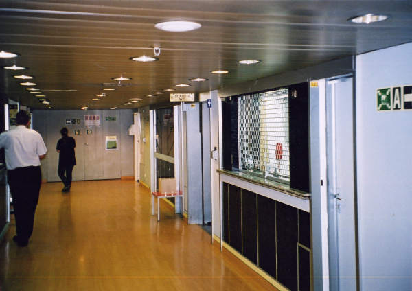 | Below: Just forward of the aft bar is the main lobby, complete with purser's office. This is the view looking directly across to starboard. The laminate flooring is a recent addition; as built this area, as with much of the ship and her sisters, was completed with dark khaki floor panels. |