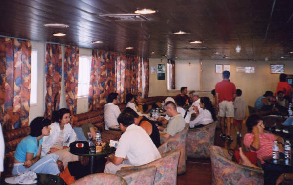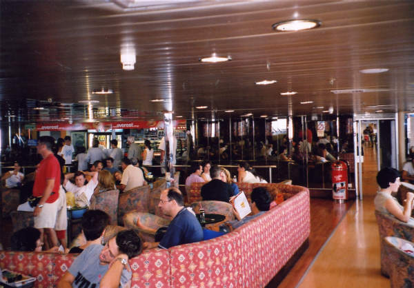 | Below: By 2003 when the picture below was taken, the bar (as with all such outlets on board) had assumed the Everest brand found aboard most of the Hellas Ferries fleet). In the intervening period all of the free-standing chairs have been re-upholstered. |