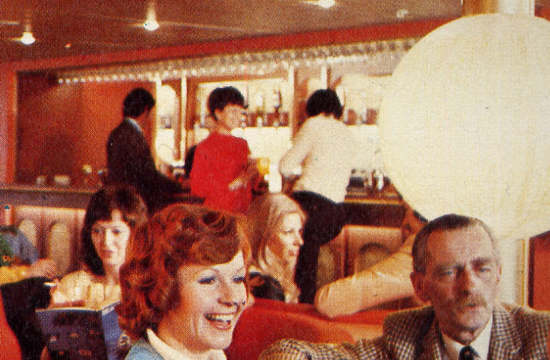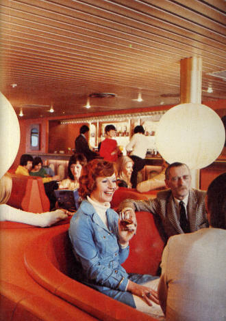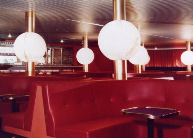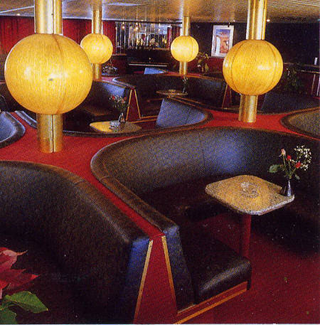 | Top: Senlac's forward A Deck bar was one of the best examples of Ward & Austin's work for Sealink. This picture is looking forward from the port side and shows the central semi-circular booth seating, the column-mounted lights, and the bar servery. In this view, the windows on the far side are hidden by the matching red curtains, that area being illuminated by concealed lighting. (Picture courtesy Bruce Peter) |