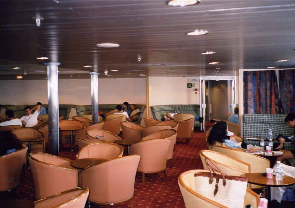 | Below: On board Express Apollon in July 2003. Looking aft from adjacent to the bar counter, the change is evident with the central area now cleared of the fixed semi-circular booths. However, the sofa seating seen to right and aft is original, albeit reupholstered. That in the background actually was originally part of the adjacent coffee lounge and the small bulkhead division seen on the right hand side (behind the curving sofa seat) originally extended across this space forming two entirely separate rooms. |