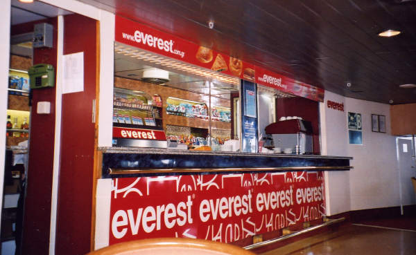 | The main bar on board was located forward on A Deck. Reviewing the Hengist in July 1972, the Motor Ship was lavish in its praise of this space: "By far the most luxurious room is the [forward] Bar, decorated in an overall colour scheme of green and gold. Sumptuously carpeted throughout in shades of light and mid green, carpeting is even extended up the table supports, the bar has green-grey wrap-around chairs and semi-circular sofa-type seats clustered back-to-back in groups of four semi-circles. Rising from the centre of each group is a gold-coloured pillar with a large spherical light fitting positioned halfway down it. Small imitation marble-topped tables are included and three of the bulkheads are curtained in olive green, illuminated by hidden lighting behind the ceiling. A large attractive bar is fitted at the forward end". On Senlac, the colour scheme was radically different, being a dark red rather than the green of Hengist. That apart however, the spaces were identical in arrangement and fitting, and proved to be one of the longest-standing and most succesful of the Ward & Austin designs of the period. As with her sisters, the Senlac's main bar had an adjacent small coffee lounge - the purpose of this was originally to provide passengers enjoying the service of the waiter service restaurant just aft with a space to retire to for coffee, having completed their meals. Whereas this space was merged with the bar on Hengist and Horsa in 1986 whilst still in Sealink service, on Senlac a similar conversion did not take place until some years after the ship went to Greece. In Greek service, the area was refurbished by Ventouris, with the seating becomeing dark blue; that apart however, there was only modest change until the major Hellas Ferries refit at the end of the century. After this, the original semi-circular booths have largely disappeared, being replaced by conventional free-standing seating around small circular tables. Around the edges, however, the original sofa seating has been retained and the bar servery, despite initial appearances, is mostly intact. |