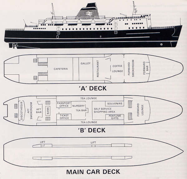 | Above: A simple deckplan of Hengist/Horsa as they were when introduced in 1972. For the third ship, Senlac, the layout was identical apart from the arrangement of the shopping area on B Deck (a walk-through arcade as opposed to the self-service Duty Free shop of the 'H ships') and the restaurant/cafeteria on A Deck (a completely revised scheme with a port-side galley alongside a long starboard-side space with cafetera aft and restaurant forward). For a more detailed and comprehensive plan of this class of ship, see the original Hengist General Arrangement plan. In Greek service, the forward lounges have been reserved for distinguished class passengers, although the lower of the two appears to alternate depending on demand. Together with the restaurant, these areas are in theory carefully guarded by crew, whilst all other areas are available for all passengers. Beneath the car decks, the ship was equipped with passenger cabins for 24 passengers - these remain in passenger use today, being available to economic class passengers. Distinguished class passengers instead have the luxury of the former officers' cabins forward on the Boat Deck, which have now been opened up for passenger use. |