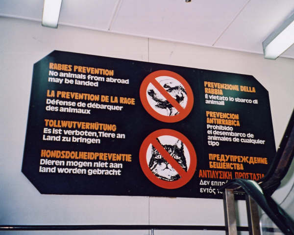 | Below: Bizarrely, even though the ship regularly carries passenger's pets in her domestic trade to and from the Greek islands, Express Apollon retains this large Rabies warning sign in one of her aft stairwells, even with additional Greek translation! |