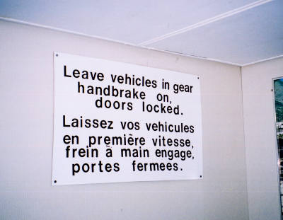 | Below: Away from the main passenger spaces, old signs are even more common - this is a warning for motorists in one of the car deck stairwells, in English and French. |