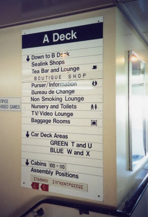 | Below: Even on the occasions that a ship has been severely refitted in later years, there are almost always clues to be found of a former life - such is the case on Senlac today as Express Apollon. Although much of the original fittings have been removed, the main artworks remain (in the shape of the Belsky Mural and the bas relief panels in the restaurants). Signage is always something that tends to linger, often for decades or more - in the example below from adjacent to the entrance to the cafeteria can be seen a British Rail-era sign with reference to 'Sealink Shops', the non-smoking lounge (a reference to the aft lounge on B Deck), and a TV/Video Lounge (the orignal disco and long-since removed). This picture was taken in 2000 - sadly a Hellas Ferries refit in 2001/2002 saw this finally removed. (Picture courtesy Richard Seville) |