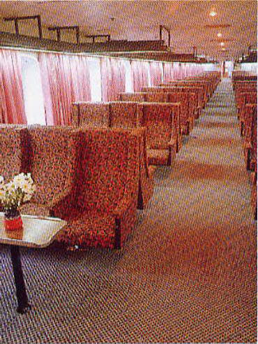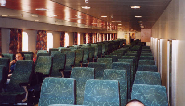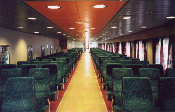 | Below: A more recent Greek refit has seen the area comprehensively refitted with new seating, flooring and even ceiling panels. This scene is in the port-side lounge - whereas originally there was face-to-face seating around small tables, this arrangement has been replaced with reclining seats throughout. The only recognisible fitting are the framed advertising panels (left). (Picture courtesy Richard Seville) |