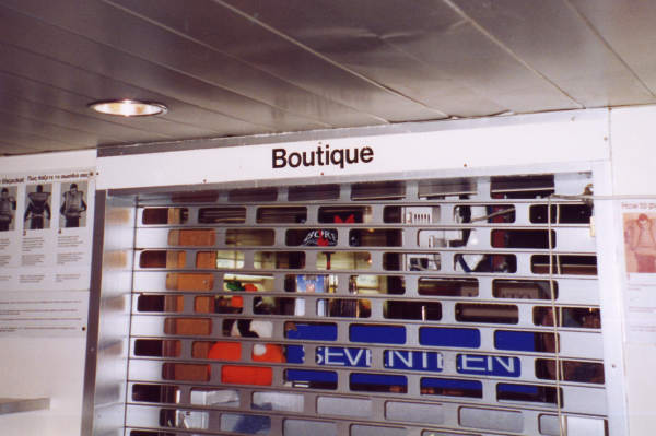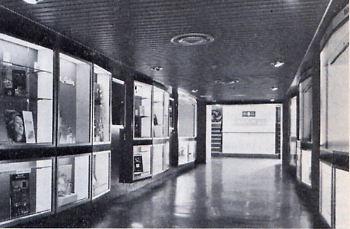 | Top: The walk-through shopping arcade on Senlac as built, looking forward. This was an attractive space with four separate counter-service outlets with cabinets on either beam in between the counters filled with displays of goods for sale. |