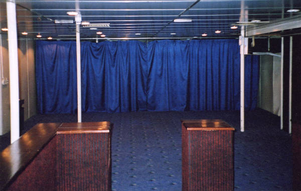 | Below: The same area on the Express Apollon in 2003 - this time looking aft from the forward lobby. With the shops and cabinets on either side stripped out when Sealink converted the space to a supermarket, it was latterly used by the Greeks as a video games area. This has now ceased and the area is now officially closed to the public. |