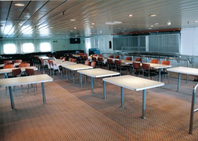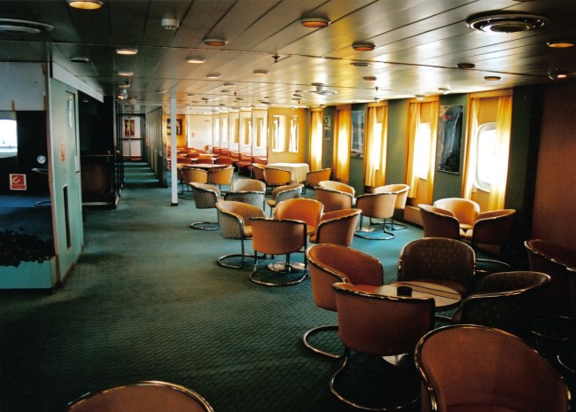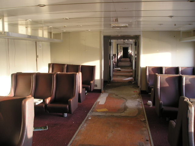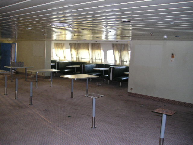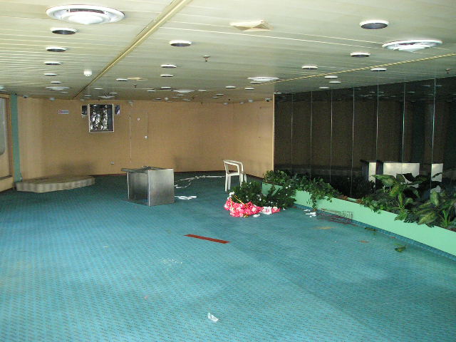| ABOVE & BELOW: Comparative views of the forwardmost of the port side lounges on B Deck, at the scrapyard (above, January 2005) and in service (below, July 2004). The laminate flooring installed by Hellas Ferries has again been removed, as have the framed prints from the bulkheads. |